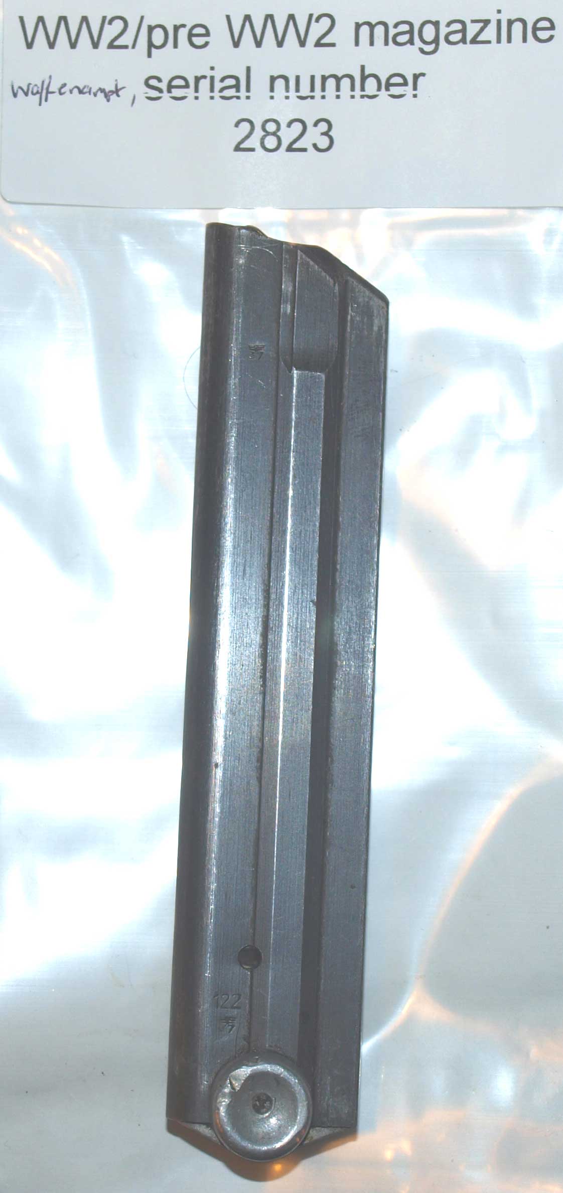 WW2/pre WW2 Luger P08 magazine with aluminium base-scarce. Genuine item, photo shows actual item that will be sent. One Only, Good used condition, blued finish, worn from use, 2 Waffenampts to right side. Serial Number 2823. Unusual shape to bottom of magazine, squared off rather than angled