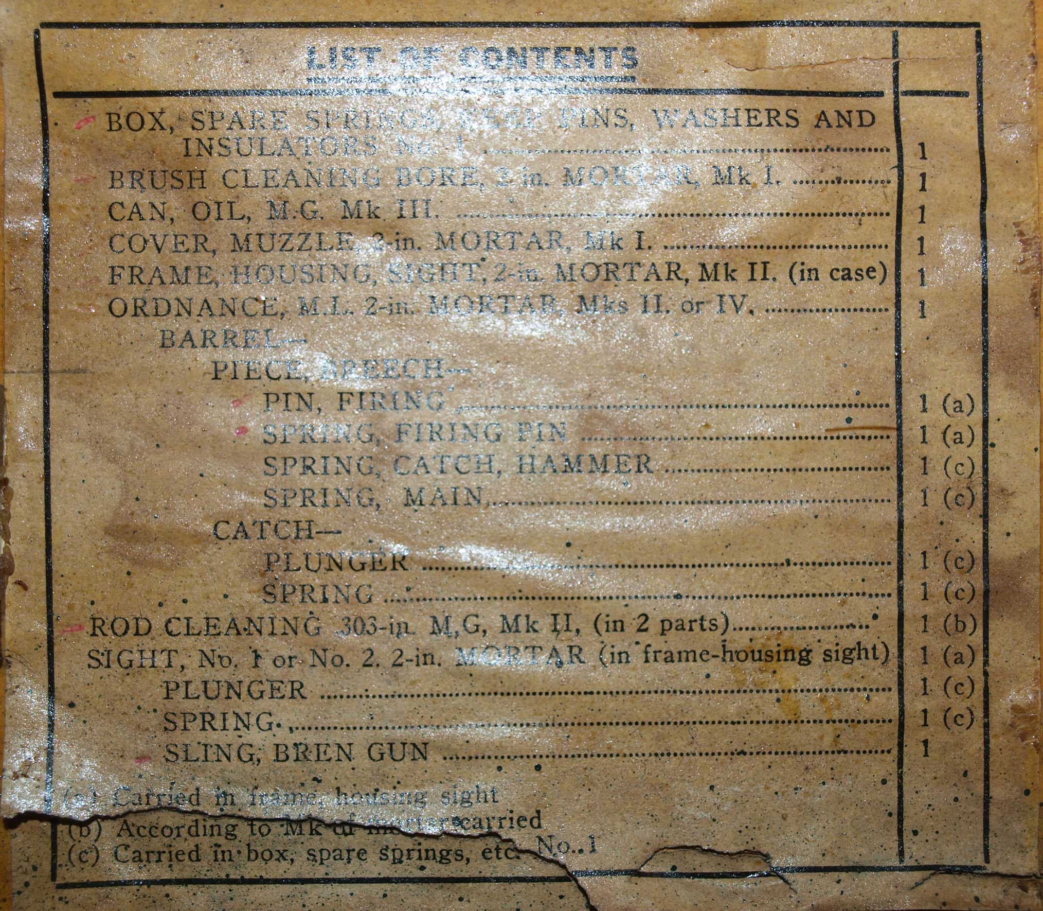 The mortar came in its box (a rare item in its self) which has an early CES list in the lid (some items do not apply as they were changed as the war progressed) and has the following accessories with it :