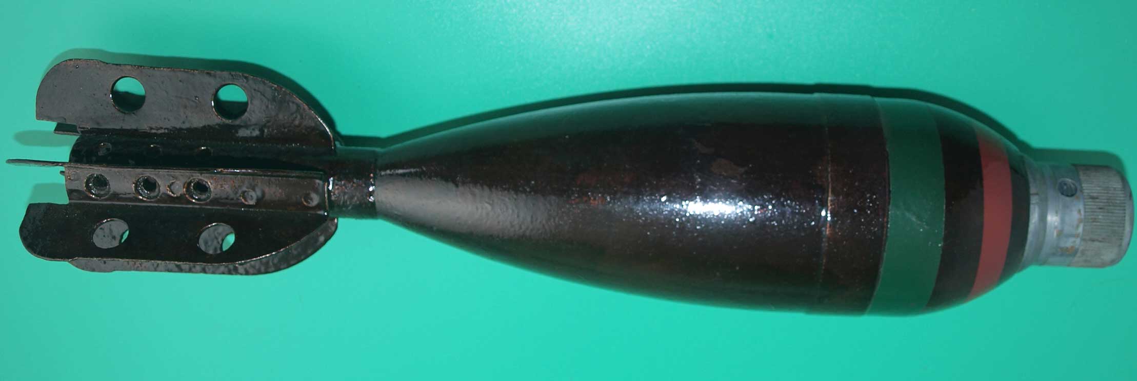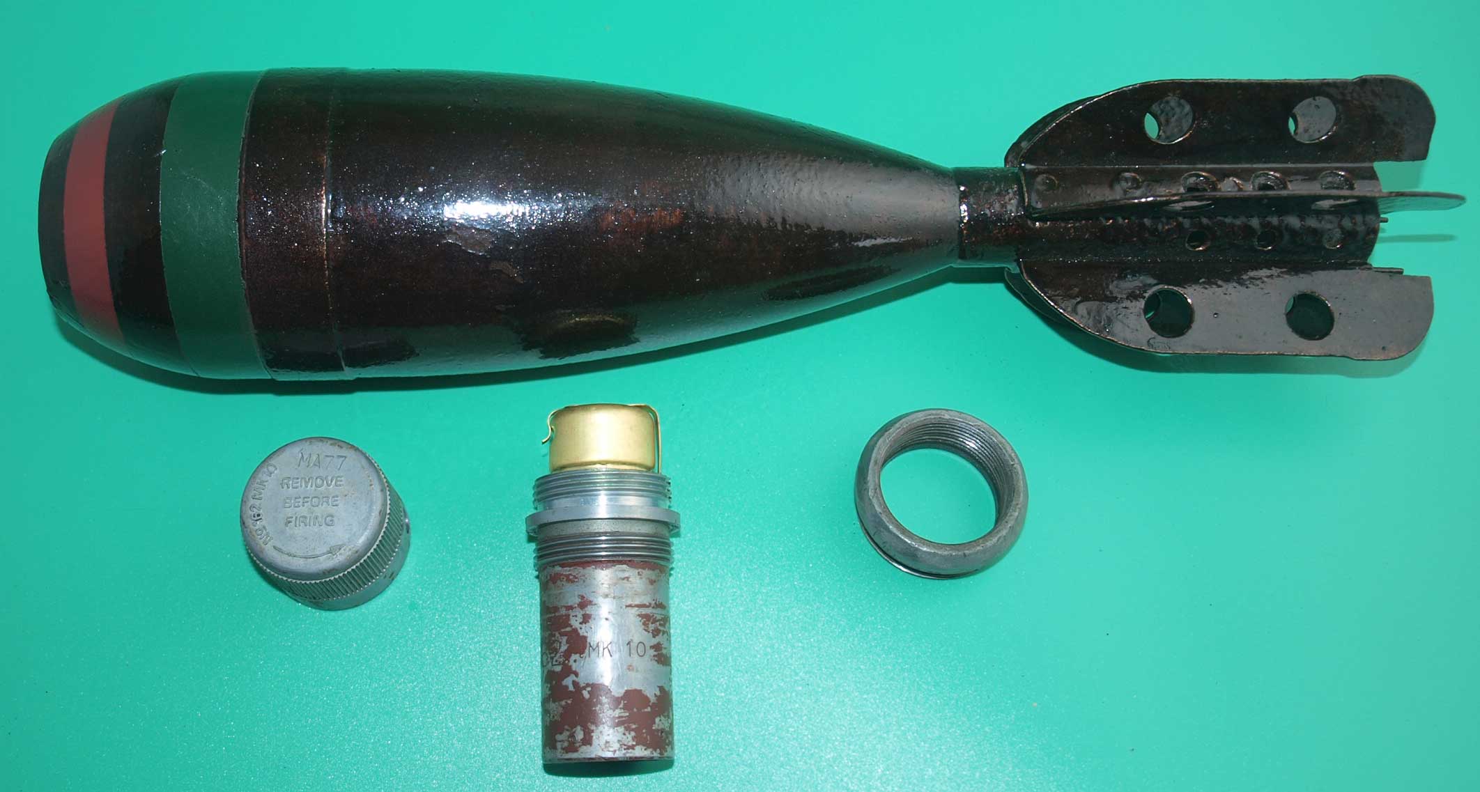 Inert WW2 3" Mortar HE Bomb MkIII comes with inert fuse 162. Repainted varnish to simulate WW3 Laquer appearance and repainted colour bands leaving you free to stencil dates and info to suit your requirements. Fuse has been disassembled to prove empty and inert. A small 'prove empty' hole has been drilled in the body but is hardly noticeable