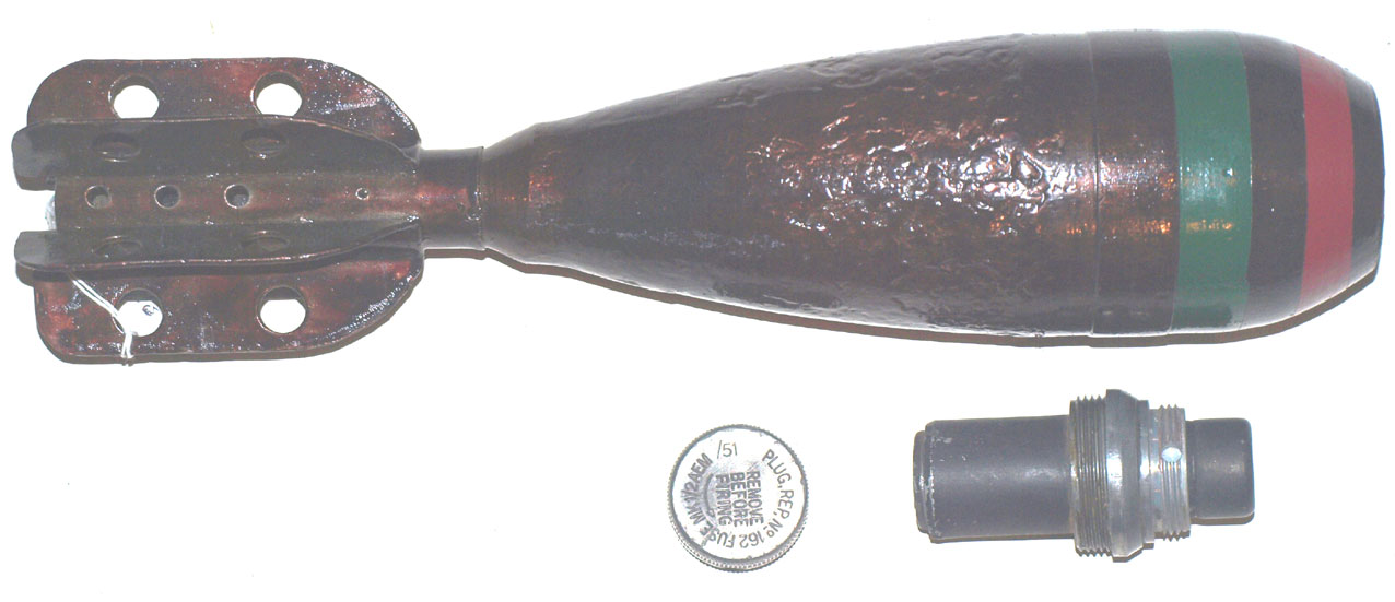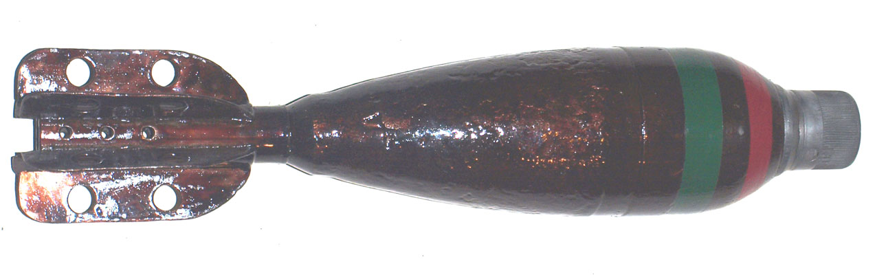 Inert WW2 3" Mortar HE Bomb, comes with inert 162 Fuse marked 162 Fuse Mk1/1 plugr replacing. Revarnished to simulate the original laquer that would have been present (NOT brown paint!) and repainted colour bands. fuse has been disassembled to prove empty and inert. This round may have been converted back from a drill round for APL as fins are marginally shorter than normal. The lower body is rough cast NOT pitted, the upper above the driving band is smooth so as to be aerodynamic.