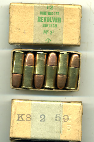 12x Boxed .38 S&W (for Enfield and Webley pistols amongst others), bullet copper FMJ with brass case, boxed in original WW2 pattern boxes with WW2 type labels (there were several different boxes and label position) dated 1959 on the bottom (typical example shown). The boxes and rounds are identical to WW2 the date is on the bottom of the box so they are ideal for display.  Copper FMJ on WD bullet heads replaced nickel around 1941/42.