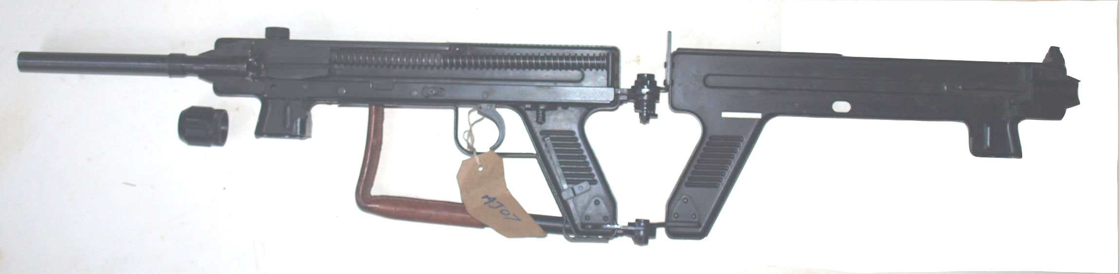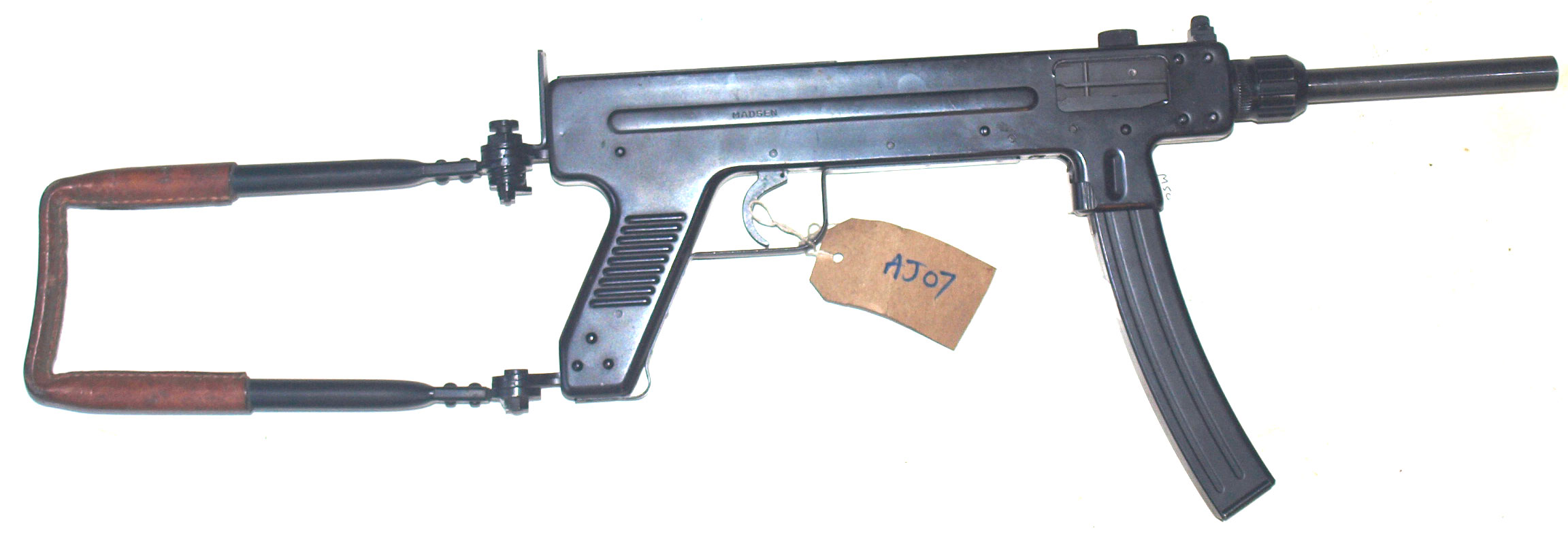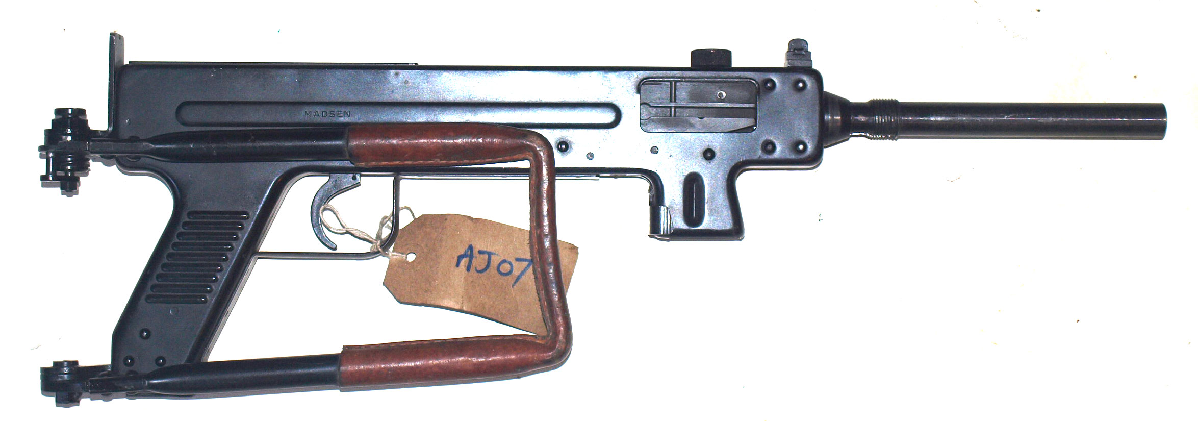 Very nice Madsen M/50. Retains near 100% finish/as new. Cocking handle non moving, this was necessary in order to retain the 'clam shell' opening' which we thought was more interesting,so receiver opens, magazine removable, tool inside grips (see photos)