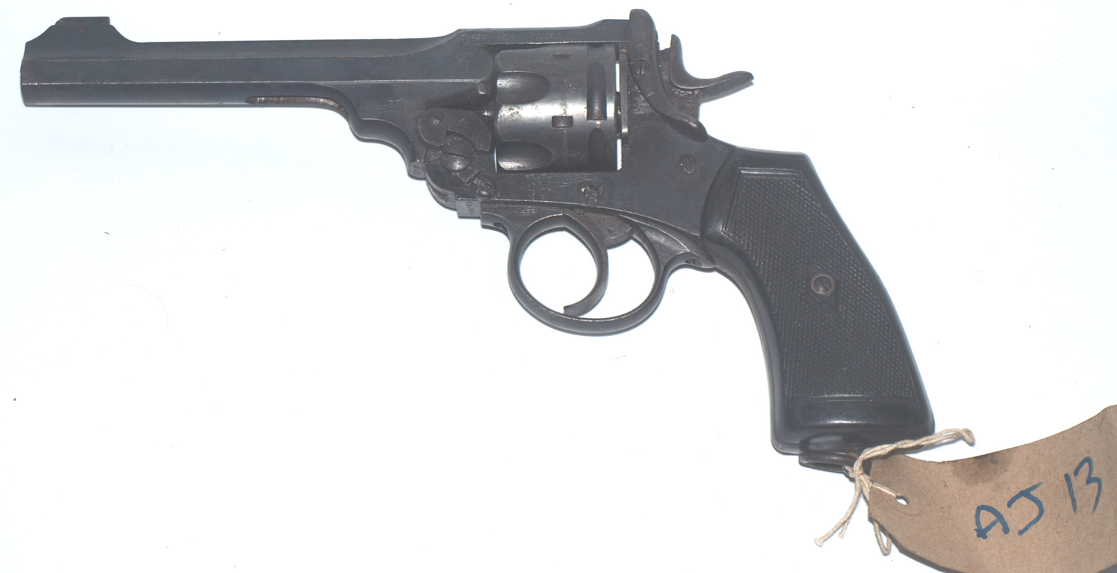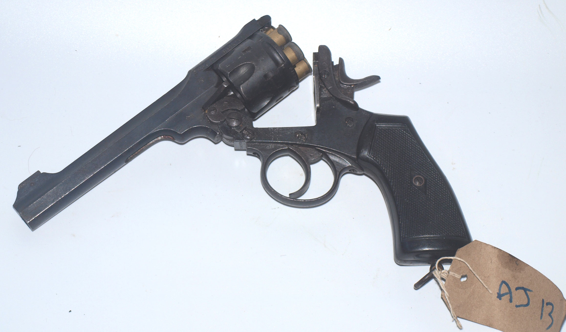 Deactivated Webley MkVI Service .455 revolver dated 1918, 6" barrel. Will chamber .455 inert rounds in cylinder (examples shown not included in sale). VGC, slight holster wear to finish commensurate with use and odd marks here and there, moving trigger and cylinder. A nice example of the WW1 Service Revolver used by Officers and specialist trades such as Machine Gunners, tank crews and air crew.