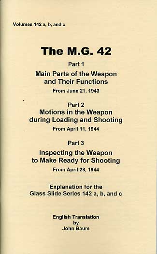 Reprint of the original but translated into English. 100 pp, approx A5 size complete with all illustrations. This manual was intended to accompany the slide show training course, it contains the 3 sections of the course in one manual; 'Main Parts of the Weapon and Their Functions 1943', 'Motions in the Weapon During Loading and Shooting 1944' and 'Inspecting the Weapon to Make Ready for Shooting 1944'
