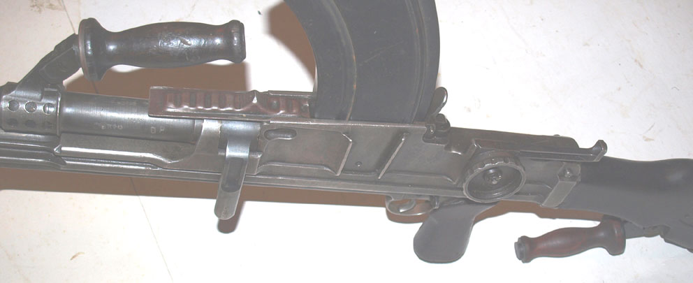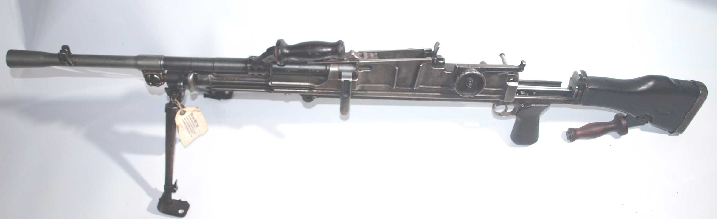 Bren Mk1 made by RSAF Enfield in 1940. Matching Barrel & Receiver numbers. Seen use but good overall condition, usual ding's to butt and some wear to finish. The barrel is the early 'long' flash hider type. The Bren has the correct 'humped' butt, drum sight, carrying handle, extending bipod legs etc. Fully Deactivated in our own workshop, working action, strippable (not barrel as is always the case), complete with magazine and deac' certificate. All of the Mk1's in this batch which are available from us and some of our competitors have been used as DP, small DP is stamped in near serial number and the barrel was drilled. We have welded up the holes, hand filed and sympathetically refinished thus retaining the original finish rather than painting with Sukorite which was not in use during WW2. Bipod legs little sloppy from use.