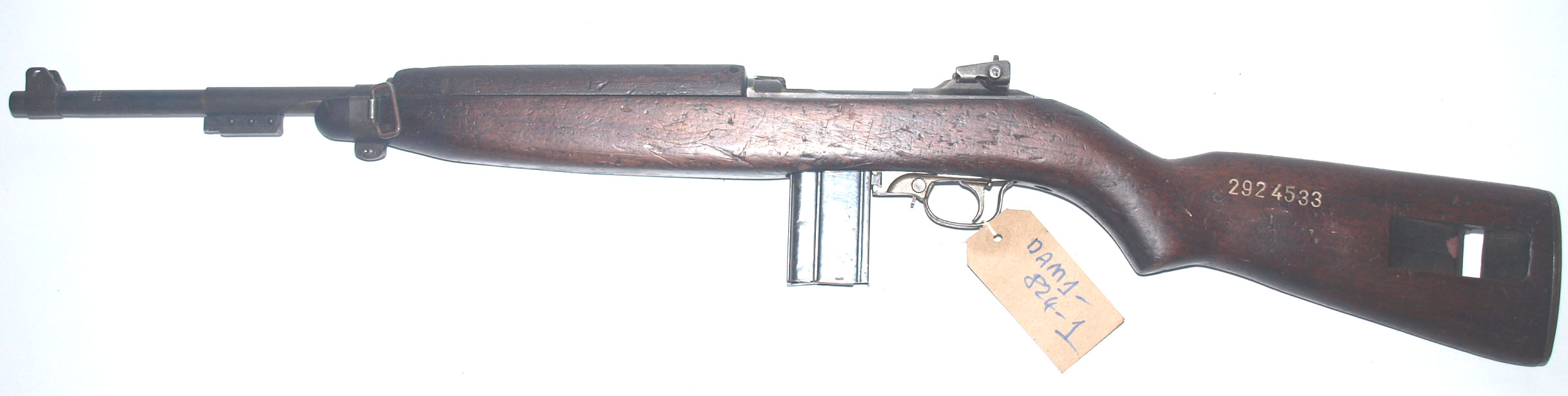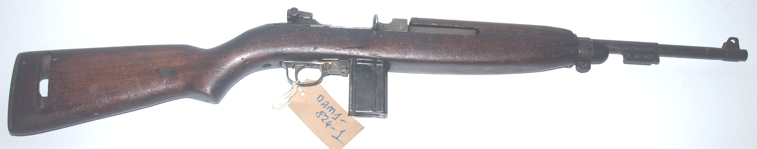Inland Div manufactured M1 Carbine, according to serial number it was produced between September 1943 and January 1944, the barrel is dated 10/43 which fits, modified rear sights and bayonet bar began as in-unit mod's at the beginning of 1945. Overall fair to good condition, has seen a lot of use so wood has marks/dinks. Dark coloured wood furniture with serial number stamped in left, retains most finish but worn, moving cocking handle and trigger, moving/working safety lever. Magazine removable (used condition).