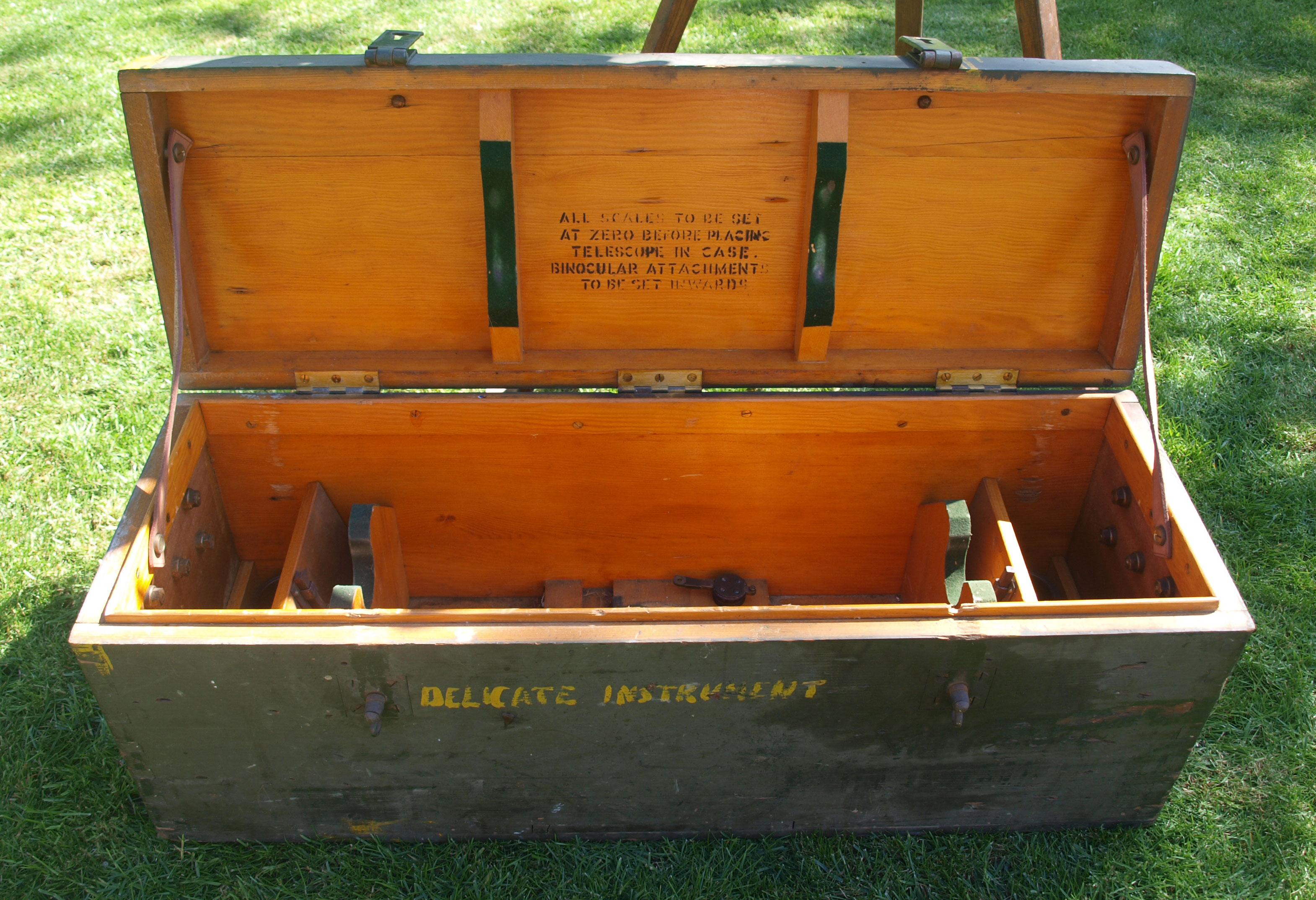1940 dated Telescope Identification with 1940 dated Stand Instrument No27 and transit box with both sets of tinted lenses.