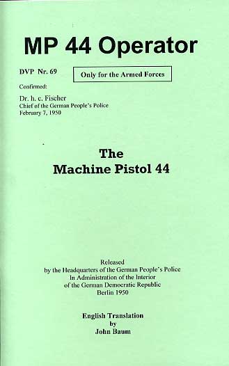 Reprint of the original but translated into English. 34 pp, approx A5 size complete with all illustrations. This manual covers the German MP44 and was printed for the East German Police in 1950, the information however will be identical to the WW2 manuals of 6 years before. It was intended for users and thus details the day to day operation of the weapon as well as its mechanical functions.Lots of diagrams and illustrations.